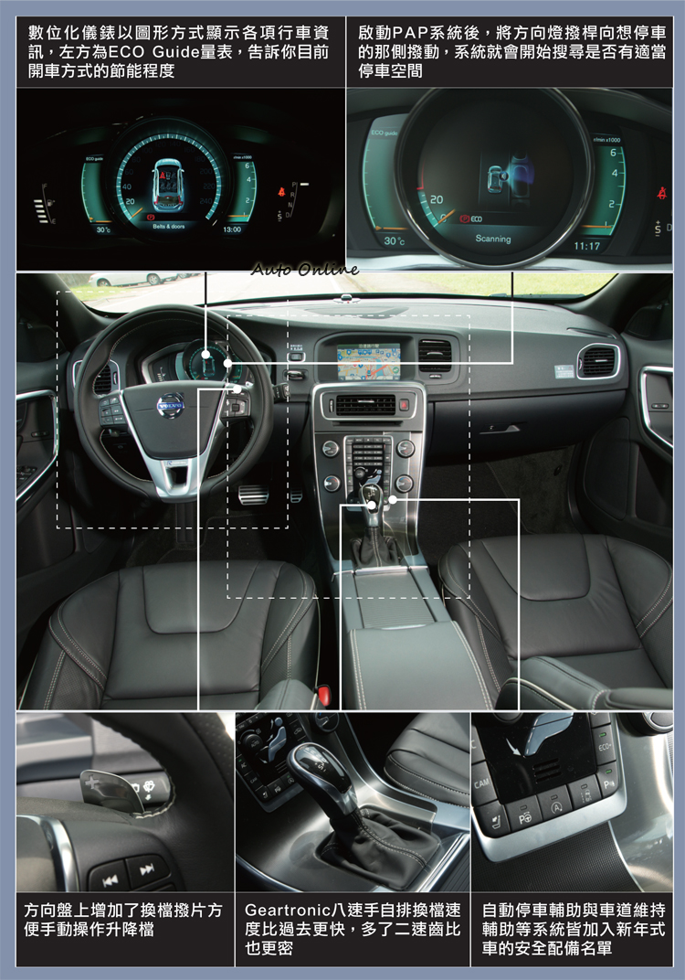 2014年式V60 R-Design也在本就琳琅滿目的安全配備名單中再添加了幾筆,包括EPAS速度感應式電動動力輔助方向盤、LKA車道維持輔助系統與PAP自動停車輔助系統,另外還標配了讓前輪起步時循跡性達到最佳化的Launch Control功能。其中自動停車輔助系統的加入,相信也讓不少準車主們躍躍欲試。