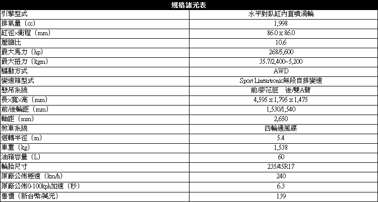 WRX搭載全新世代FB系列引擎 無段變速有加分效果