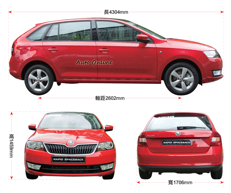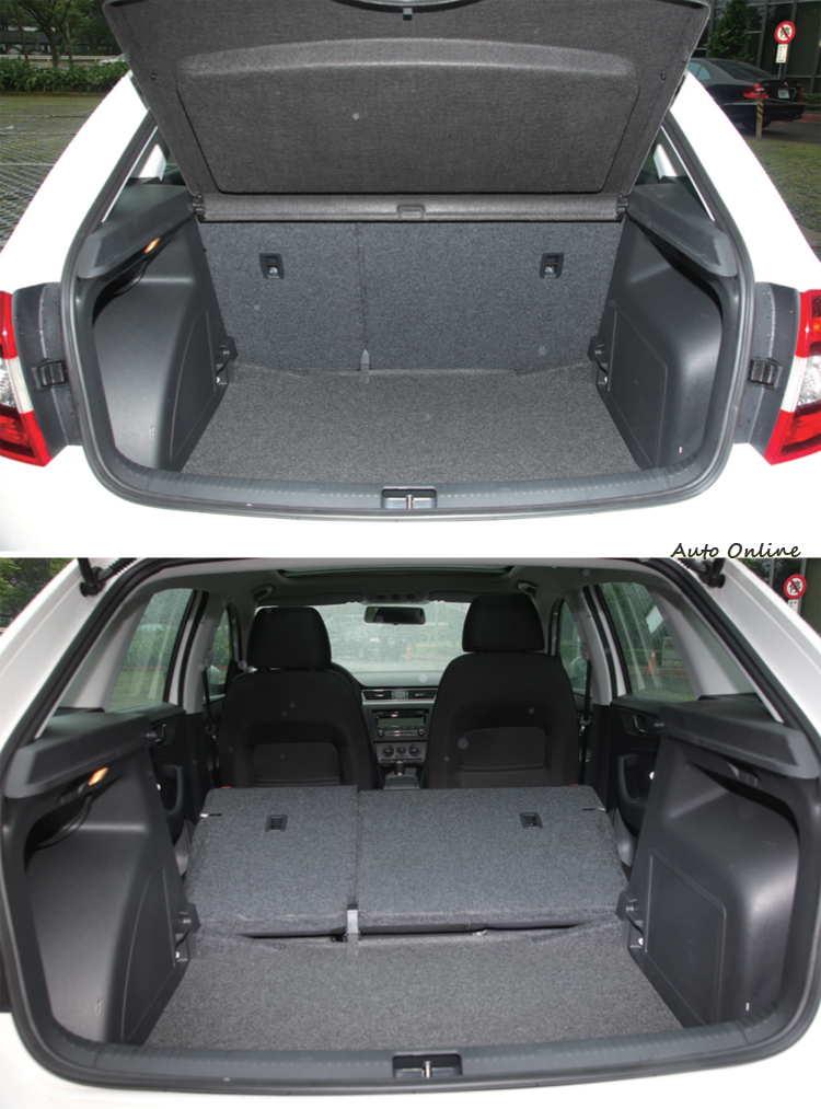 而跟A3 Sportback相比,也由於設計手法的不同,前座頭部空間與標準行李廂空間大致相同,但後座頭部空間與放倒後排座椅之最大行李廂空間Rapid Spaceback都分別多出25mm與129mm,標準狀況下行李廂容量為384公升、後排放倒後的行李空間則達到1349公升,優異的空間表現,難怪車廠要稱它Spaceback。