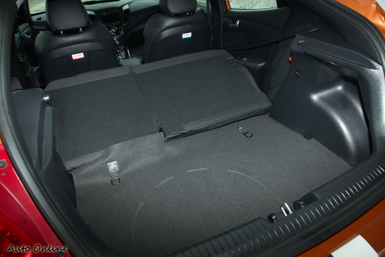 車後行李空間也可以配合60:40分離可倒的後座椅向前放倒椅背來擴增。Veloster Turbo在外觀搞怪之餘,車內其實還是蠻規矩的。