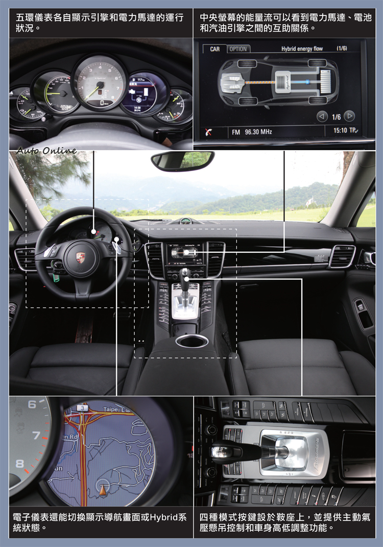 ![]() ▲全身肌肉感十足的Paramera強調是一部100%的保時捷跑車。PORSCHE的個人化精裝配備選項是出了名的豐富,精緻高檔的選配當然不會太便宜。試乘車所選配的項目,包括將頭燈升級為包含動態照明升級系統(PDLS+)的全LED頭燈,輪胎也由18吋換成20吋的Panamera Sport鋁圈型式,光是這兩樣就要價近30萬。內裝方面配備則更多,主要包括:前座椅通風系統、四區恆溫空調系統、電動天窗、14向電調座椅及功能套件、頭枕盾型徽飾印記、髮絲紋自發光鋁合金門檻等。而音響也順便升級為BOSE環繞音場系統,當然象徵先進豪華座艙的通訊管理界面(PCM)也絕對少不了,再納入環景顯像系統、停車測距輔助功能、跑車計時套件,總算像是一部豪華GT該有的樣子。