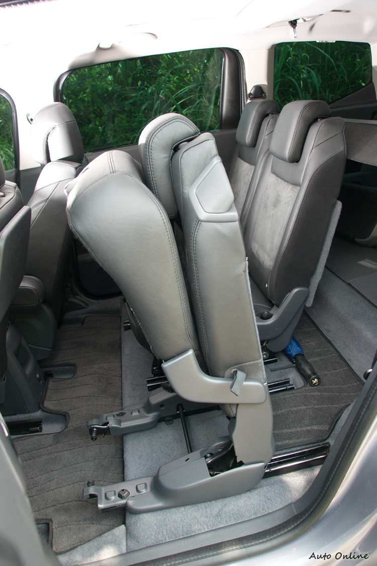 與第二排座椅配合之下,因為均可獨立翻倒或立起椅背,所以可以依照乘坐人數或行李放置的不同需求做多種彈性變化,比方說放衝浪板這類長形物品就只要放倒第二、三排單側座椅就好。