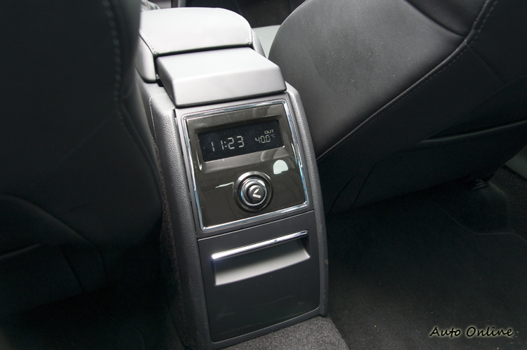 觸控螢幕下方則是雙區恆溫空調操作介面,在B柱的地方也有空調出風口照顧到後座乘客。比較有趣的是在前座中央扶手後方除了12V電源插座外,還有時間與車外溫度的顯示幕,似乎是希望對後座有更好的待遇,可惜顯示幕跟真正的後座空調控制介面之間還是有些差距。