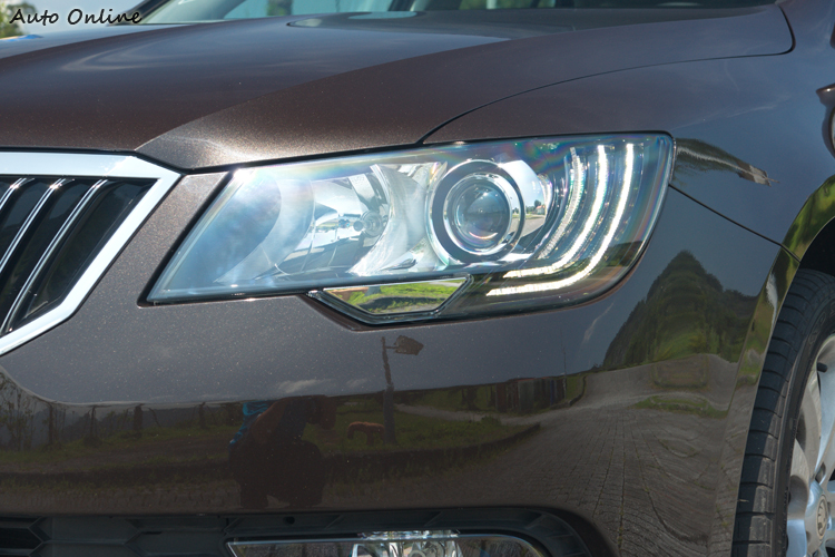頭燈、霧燈與保桿氣壩造型沒什麼改變,不過在這次試駕的Superb Combi 2.0 TDI旅行車型上則標配了具主動轉向功能的氙氣放電頭燈與三道C形光條的LED日間行車燈。