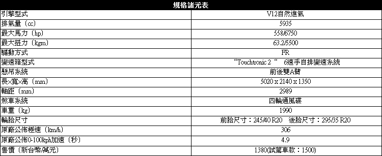 雖著越來越嚴苛的排放標準,各車廠掀起一股小排量加渦輪的設計浪潮。因此對於能夠試駕到6.0升 V12自然進氣引擎的車款讓人全身細胞都活了過來。因為也許再過些時日這V12引擎也將成為絕響,畢竟不到10km/L的油耗水準要撐過夠嚴苛的排放標準似乎難度越來越高,所以把握當下的每一秒吧!