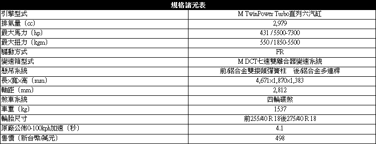 因此3系列與4系列系出一脈,底盤與懸吊配置都相同。而這次所試駕的M4其實就是過去的M3 Coupé,與現行M3相比M4 的4,671mm車長與2,812mm的軸距是相同的,但車寬車高度少了7mm與14mm。