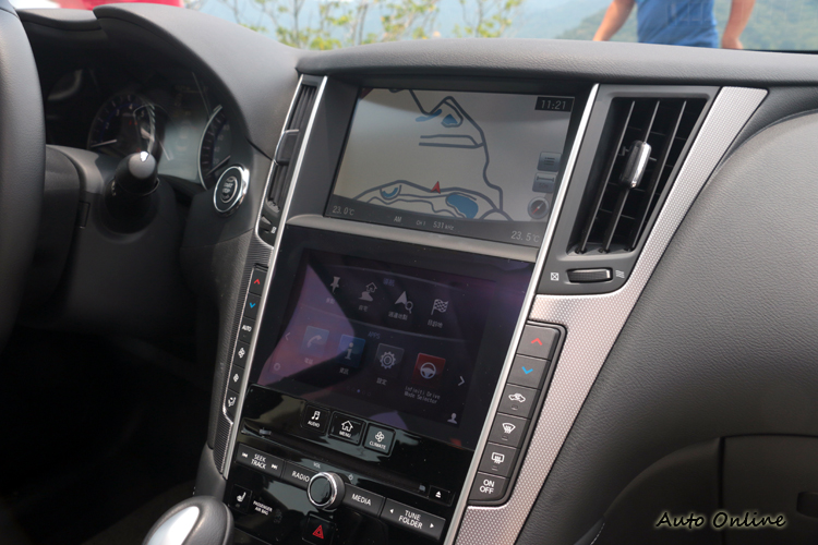 ![]() ▲日系車內裝較為花俏,不過Q50不僅花俏,還導入不少高科技產品。日系車內裝較為花俏,不過Q50不僅花俏,還導入不少高科技產品,像是Intouch雙螢幕主控台,分為上下螢幕減少行駛中不必要視頻切換。 ![]() ▲Intouch雙螢幕主控台,分為上下螢幕減少行駛中不必要視頻切換。![]() ▲座椅豪華、舒適滿分,運動、包覆還有進步空間。