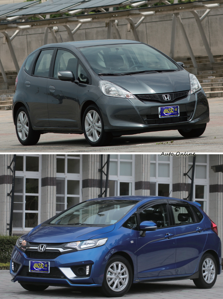 ▲進入第三代的FIT(藍車)在車身鈑件上做出許多明顯的摺痕,營造出更為強烈的運動氛圍。