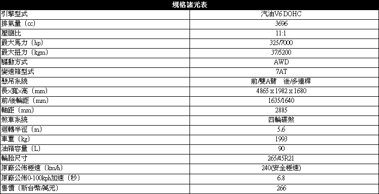 實際操駕體驗,發動引擎瞬間,喚起V6引擎隨之而來的雄厚排氣聲浪,提供跑車化聽覺饗宴,聲浪會隨著轉速不斷放大,相信很少人能抵擋這V6天籟。大排氣量引擎在乎的不是瞬間起步加速,能又穩又快線性加速特性才是它最迷人之處,套句美國佬常講的話,排氣量決定跑車該有的氣度。操控部分,以一輛接近兩噸的LSUV,你會期待它該有怎樣的表現?礙於重心高度影響,過彎就沒有加速來的靈活,不過懸吊調校得宜以及21吋鋁圈大腳加持,還是保有些許操駕樂趣,同等級對手中有中上的表現。