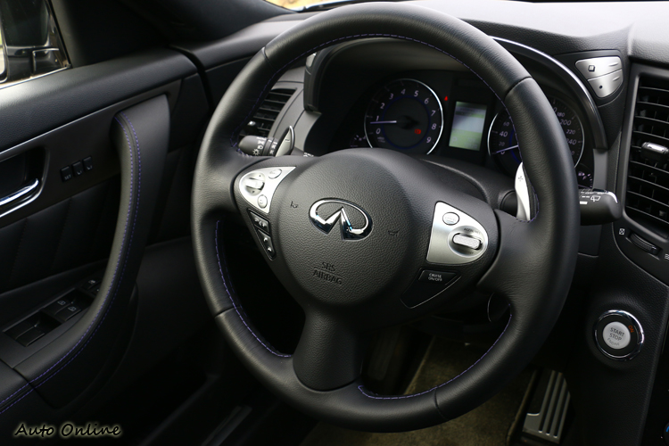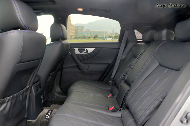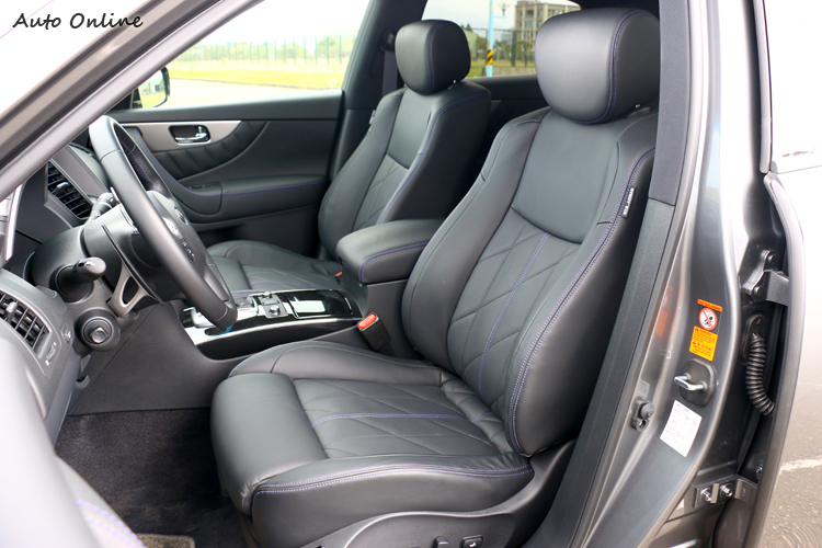 QX70S內裝有專屬的方向盤紫色縫線,與前方儀表板相呼應,兩張前座跑車化座椅,縫線部分也改為紫色,與方向盤縫線有異曲同工之妙。