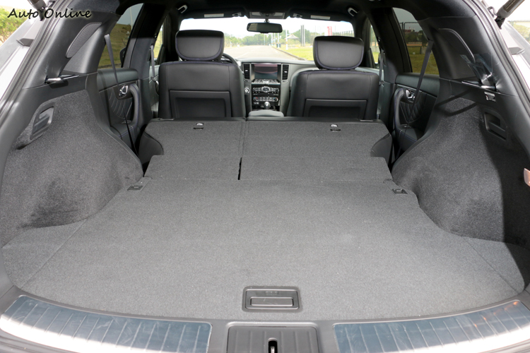 車側最明顯就是流線的車頂以及傾斜的D柱,車頂架、前葉導流風孔、側裙以及ENKEI代工21吋鋁圈在特仕車上均採燻黑處理。來到車尾,車尾銘牌改為QX70S,左右雙出排氣管、後尾燈造型以及上方尾翼都維持原樣。大膽玩色是很多車廠慣用手法,但是要如何在有限資源裡,達到加分效果,考驗車廠玩弄色彩的藝術,誠實說QX70S黑曜戰神特仕車是成功的。