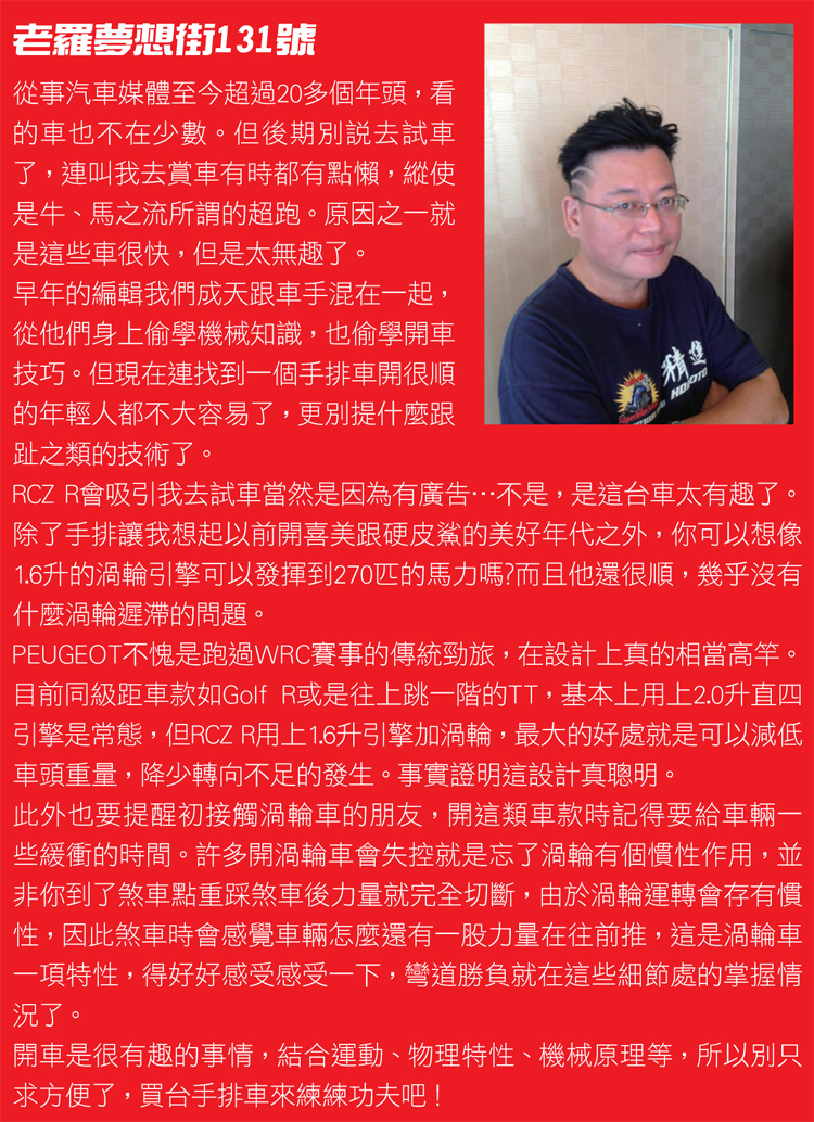 Max大話車壇![]() ▲三個踏板才對味嘛,手排復興運動需要你我加入。如果大家還有印象,最早RCZ進來的時候有兩款,一款是自排 156匹版本,另一款則是200匹的手排版。當初試車時覺得這台外型性感又銷魂小跑出搭配200馬力與手排變速箱堪稱夢幻逸品,怎麼樣都好想要來一台。殊不知原廠說手排版的不賣了! ![]() ▲車輛由PEUGEOT SPORT 團隊打造,類似BMW M廠的味道。舉例來說RCZ R的懸吊已經是強化後的運動版,但行路感還是保有一定的Q度,市區道路使用並不會讓人感到不舒適,我們都覺得它比市售一些改裝競技避震器都要來得舒適。 這樣的配置好處是不會嚇到剛接觸鋼砲車款的車主,也可以跟家人說這台車不是飆仔開的,你看它多舒服啊。不過對於極左派性能迷來說這調性太溫馴,溫馴到個性都不見了,加上不是很有魄力的排氣聲浪讓這台征戰紐柏林賽道而生的猛獅稍稍馴化了些。
