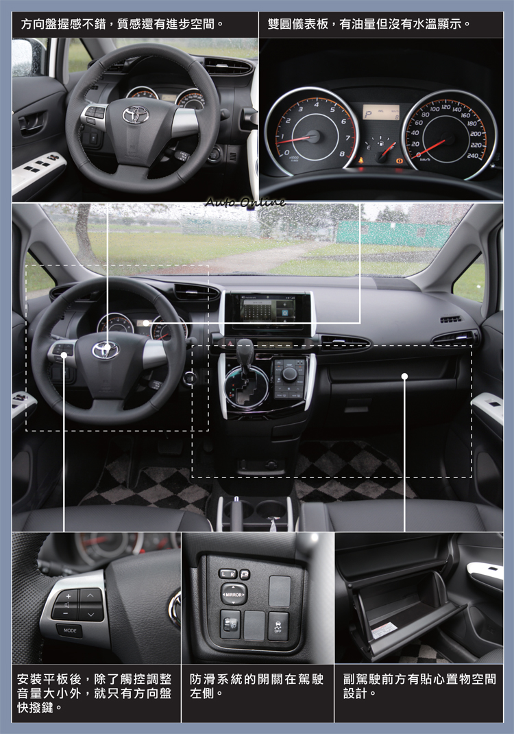 2015年式TOYOTA Wish除了增加影音系統配備外,其餘就與之前相同,中規中矩的內裝,不太容易犯下任何錯誤。空間實用性是Wish一直以來最大優勢,也因為這樣,被許多計程車司機喜愛;但三排座椅的設定,在不時之需可以乘載到七人,甚至後行李箱內還可放入腳踏車,論一般家庭使用,這樣的空間變化,足以滿足任何需求。