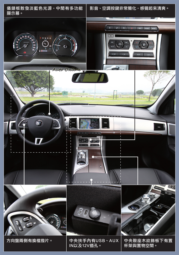 車內如同車外,在B柱之前與XF Sedan沒有明顯差異,像是智慧型自動開啟空調出風口、JaguarDrive Selector™ 旋轉式排擋座、JaguarSense™ 觸控感應裝置等呈現出奢華簡約乘坐氛圍。