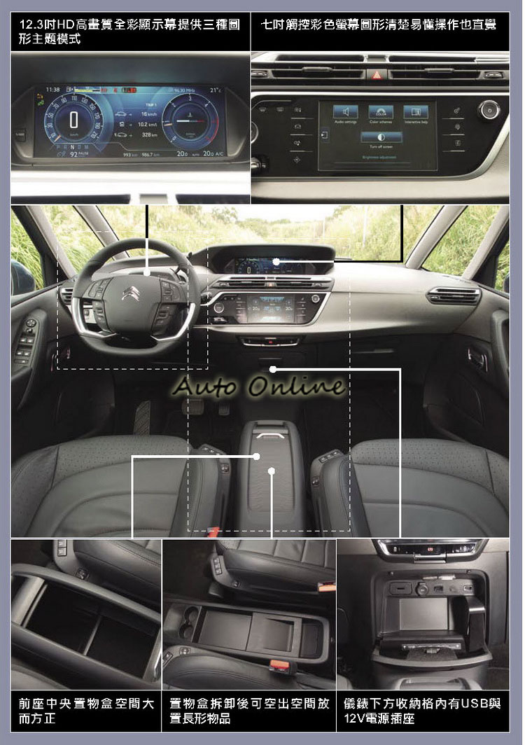 而12.3吋螢幕則可顯示包含時速、轉速、燃料與自動停車輔助等相關資訊以及透過USB播放jpg格式的圖片,所以保持Picasso的慣例,要判讀車速、轉速資訊視線請向中控台移動。除了顯示項目的切換外,並提供三種不同的圖形模式做切換,就好像更換手機的桌面主題一樣。