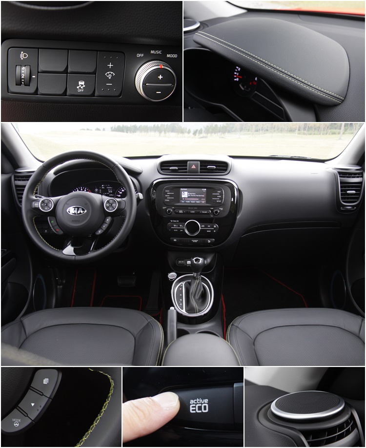 儀錶板內設有旅程電腦顯示里程和油耗資訊,也可以用來設定車輛功能,並能顯示正在播放的曲目。至於方向盤上也設置了音響、電話接聽、定速巡航,以及Flex Steer可變駕駛系統模式的切換鍵,讓駕駛選擇經濟/一般/運動等三種模式進行切換。Soul的標配項目也將Push Start、自動恆溫空調和熄火延遲關閉頭燈功能納入,在便利性和舒適配備方面的表現都對得起它的售價。