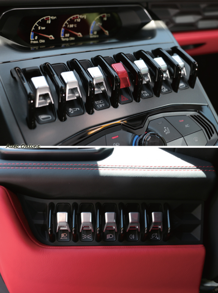 Huracán 以駕駛者介面為導向,所有的控制單元都在駕駛者雙手可觸及範圍,不需要刻意挪動身體,其中方向燈的控制及雨刷的控制,跳脫以往設計在方向盤後方的撥桿移至方向盤上,左邊的按鈕控制方向燈、右邊則是控制與雨刷,大燈開關設計在駕駛左邊冷氣出風口下方,剛開始會有些不適應,使用久了倒覺得這樣的設計更為人性化。