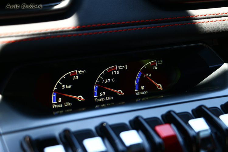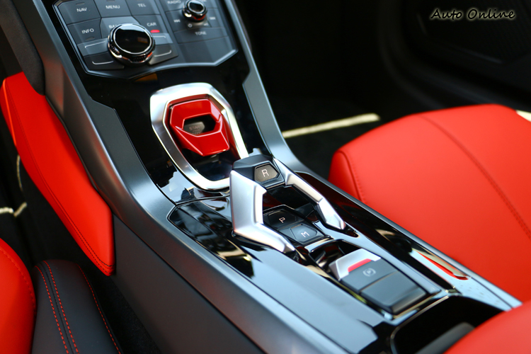 說了那麼多Huracán 的技術層面,緊接著要進入實際體驗的重頭戲。引擎啟動按鈕安置在中央鞍座中間,造型類似飛機按鈕並漆上亮眼的紅色,按下按鈕換起後方5.2升V10自然進氣引擎。