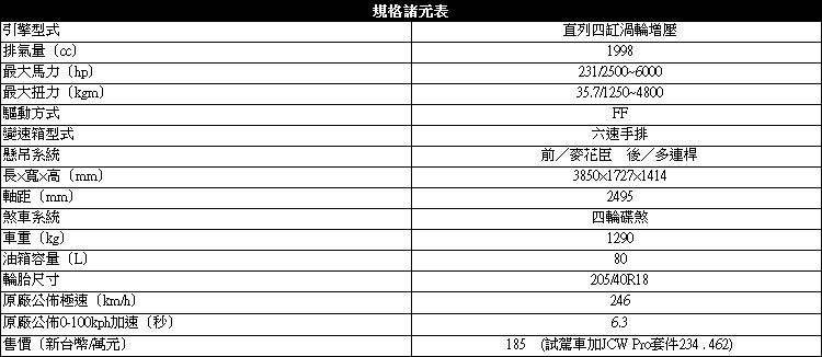 樂趣、品味不能用價格衡量![]() ▲MINI JCW整體戰鬥力比起Cooper S高一個層次,沒有砸了JCW的招牌。MINI JCW整體戰鬥力比起Cooper S高一個層次,沒有砸了JCW的招牌,不過經過JCW調校後建議售價為185萬元(試駕車款選配JCW GP套件後為234萬元),這比我們之前試駕過AUDI S1的178萬元高出許多。馬力同為231hp,S1四輪驅動系統加持下,加速速度更快,過彎極限更高,駕駛還能在彎中透過重心轉移做稍微推頭或甩尾的改變,操控感與樂趣大於MINI JCW。而MINI JCW的贏面我想應該只有它的時尚敏銳度,兩台車同時停在信義區街頭,路人的回頭率MINI JCW絕對是大勝,就像很多球鞋迷買的名貴球鞋,要的只是穿在身上的卓越感,它有什麼優越的實質功能一點也不在乎。 ![]() ▲現在的手排車好好開,起步有上坡輔助系統,放離合器電腦自動幫你補油,根本不需要學會什麼跟指。但其實手排車也並非要絕跡了,許多國家還是手排車大於自排車款,會絕跡的應該是性能手排車,性能講求的是速度、賽道成績,雙離合器自手排的推出,賽道上成績比純手排車還優異,原廠當然就沒有必要推出手排車款,像是Porsche 911 GT3手排停產。最後手排迷也不用太擔心,不是以賽道為出發點的車款,手排還是會繼續存在,恩…….那下一代的MINI JCW還會有手排車型嗎?