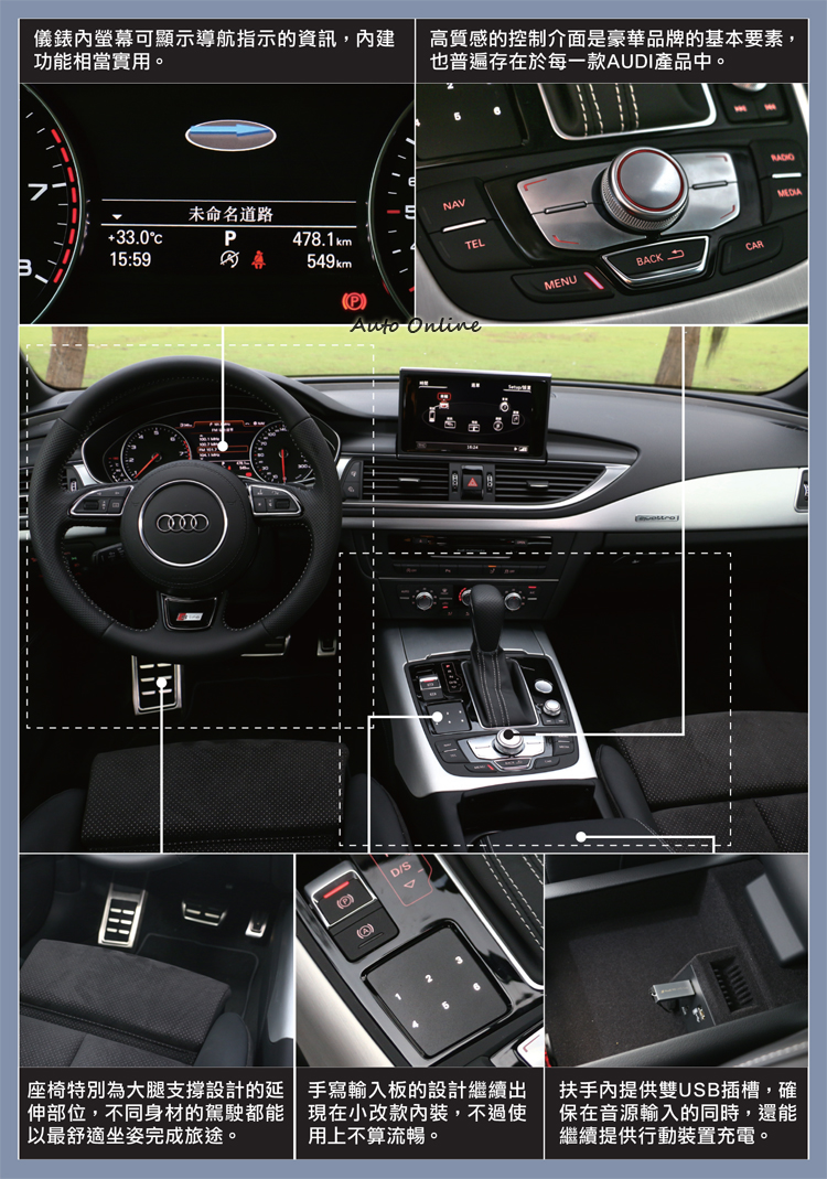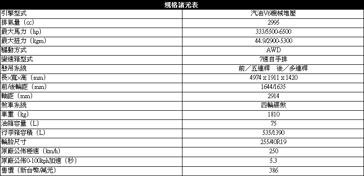 ![]() ▲3.0升V6引擎提供敏捷而高效率的增壓效果,也是運動性格的來源。運動性能是這款車的重要賣點,因此A7 Sportback和它的對手不同,它不是穿上披風的紳士,而更像是換上獵裝的運動家,骨子裡散發的運動特質一點都藏不住。小改款後僅引進單一車型銷售,選擇的動力是3.0升V6機械增壓這顆引擎。最大馬力比起過去的300hp成長至333hp,至於峰值扭力則維持不變,但峰值高原比過去更寬廣,而0-100km/h的加速秒數也推進0.3秒,只需5.3秒就能完成。長軸距大馬力車,著重在高速和長途行駛的穩定舒適,而不是用來比拼急彎的山路。不過我們還是在山路上用力開了一小段,發現quattro四驅系統毫無畏懼這樣的路況,除了無傷大雅的些微轉向不足,整體開起來相當輕鬆。而在高速的路段就是它的舞台了,縱使偏硬的懸吊讓車內駕乘者清楚知道路面品質的顛簸,還是能讓人安心一路直達180km/h以上,以官方極速250km/h來說,看來台灣任何道路都是小菜一碟。