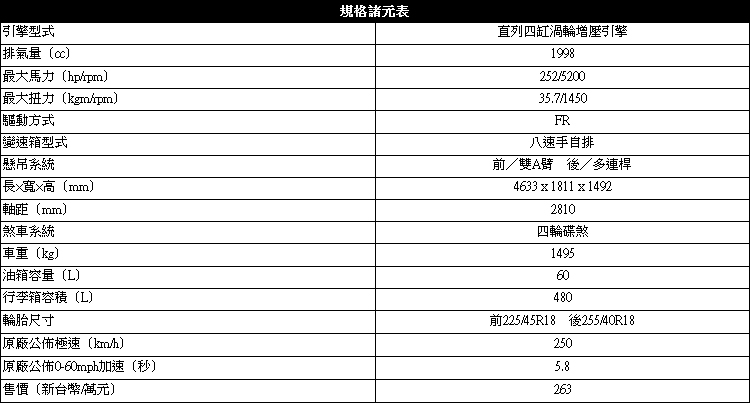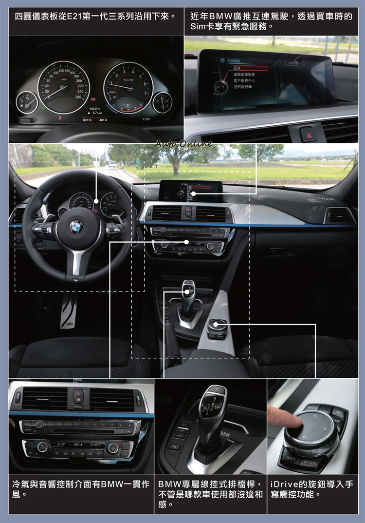 樂趣至上加速直逼E46 M3![]() 改款後的三系列,動力編成做了代號上的修改,像是我們所試駕的330i為原328i動力,340i則為原335i動力結構。330i M Sport搭載一顆與320i相同的2.0升渦輪增壓引擎,BMW科技VALVETRONIC氣門揚程可變系統、BI-VANOS雙可變汽門正時系統與HPI燃油缸內直噴技術加持後下,最大馬力小幅度提升至252hp/5200rpm與最大扭力35.69kgm/1450rpm,搭配運動化Steptronic八速手自排變速系統,達到靜止加速只需要5.8秒,這與E46 M3的5.2秒相差不到一秒,證明渦輪技術的厲害,極速限制在250km/h安全範圍內。 ![]() ▲330i的動力表現與底盤調性,帶給駕駛不少樂趣,尤其是後輪驅動設定。進入山區有如換了一個世界,330i的動力表現與底盤調性,帶給駕駛不少樂趣,尤其是後輪驅動設定。透過手動換檔模式,固定在最適合的檔位就像手排車有自主權,M款懸吊在彎中提供優異支撐性,M款懸吊不僅保有舒適性,額外帶來激烈操駕的穩定性。DSC動態穩定控制系統未關閉下,油門容錯率高,不會因為一次給太多造成車尾蠢蠢欲動,如果自認駕駛技術高超者,則能透過兩段的模式得到不同挑戰。
