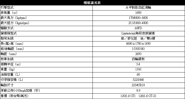 沉穩、內斂運動休旅![]() ▲原廠代號FB16的1.6升缸內直噴水平對臥渦輪增壓引擎,可發揮出170hp最大馬力。原廠表示為了符合國人需求,只有進1.6升缸內直噴渦輪引擎,日本市場有的2.0升渦輪引擎未導入台灣。原廠代號FB16的1.6升缸內直噴水平對臥渦輪增壓引擎,可發揮出170hp最大馬力,引擎轉速1800rpm開始陸續產生25.5kgm最大扭力並且長久持續維持著高扭力輸出,透過跟WRX相同的Lineartronic無段自排變速箱,能有輕盈、流暢又帶有反應性的駕馭感。再加上SAWD對稱是全時四輪驅動系統及前麥花臣、後雙A臂的懸吊設定,讓駕駛者擁有人車合一的極致操控與扎實駕駛體驗。恩,說完了原廠原廠對於引擎動力的敘述,來看看在真實的世界裡是否真有此感覺。 ![]() ▲性能跟它動感的外觀有點違和感。手緊握方向盤,將SI-Drive動力控制系統切到Sport(Levorg只有S、I兩種模式),油門盡可能保持在一半深度來得到較大動力,SAWD對稱是全時四輪驅動系統得到最佳輪胎抓地力,有WRX相同的ATV主動扭力引導系統,利用改變內、外輪動力輔助車頭指向性,減少轉向不足或者轉向過度產生(後者不太可能發生),山路上Levorg轉向精準,設計團隊在懸吊調校琢磨很深,放軟彈簧硬度加重桶身阻尼,藉由達到穩定的車身動態,原廠給的資料說Levorg操控靈敏度與BRZ相同,老實說兩者還是有些差距,光是車身重心就不一樣,只能說Levorg有著四輪傳動加持,比起BRZ易於駕馭。