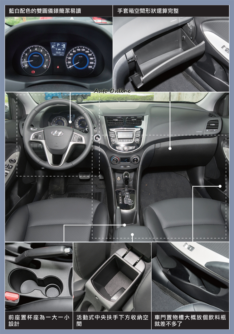 就Verna這種價位等級的小車而言,內裝用料難以避免會以較大比例的硬質塑料為主。不過Verna還是以表現壓紋處理,搭配細部皮質、銀色、黑色鋼琴烤漆塑料飾板的鋪陳來降低車室的廉價感,與同級對手相較,質感表現稱得上中規中矩。