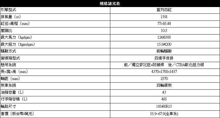 四速手自排的設定也讓車主在遇到需超車變換車道之類的情況下,可以迅速獲得所需要的加速力來安全地完成這些動作,又是它多出對手的一項優勢。不過在油耗測試數字上就沒有比較漂亮,平均油耗值為14.0km/l,經濟部能源效率等級的認證為三級。