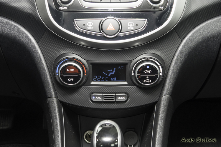 音響介面下方為空調介面,旗艦車型為單區恆溫空調,且有個小顯示幕顯示相關資訊,以下的車型則為手動空調。Verna還有一項特別的配備,就是旗艦車型的室內後視鏡整合了彩色倒車顯影功能,這個功能所顯示的車後方影像面積算大,使用時看得夠清楚,實用性不差(也可以設定不顯示)。