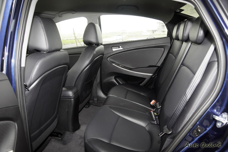 座椅方面以Verna這種價位的小型車來說,電動調整功能自然比較難以奢求,不過Verna全車系均有手動高低調整功能,尊爵型以上車型使用皮革材質包覆,且頭枕高低可調,後座椅背為6:4分離可倒。