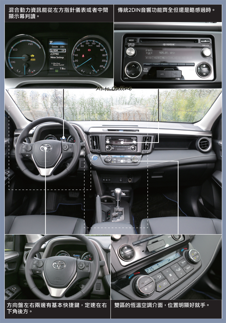油電混合動力增添市場戰鬥力![]() ▲比起前一代,第四代RAV4在操控部分有明顯的提升。來到第四代RAV4改款車型,老實說它的HYBRID混合動力比外觀還吸引人;RAV4在第一代與第三代車型有短暫使用EV系統,但因為不純熟與賣相差草草坐收,直到第四代改款RAV4,TOYOTA才將引以為傲的混合動力放在SUV車型上,而這套系統與之前試駕過的NX300h相同。 ![]() ▲RAV4 Hybrid與NX300h相同的動力單元配置。RAV4 HYBRID有EV、ECO、SPORT三種行車模式可切換,模式切換到SPORT運動化,別對197PS的綜效馬力有太大期望,大腳油門下去RAV4反應出來的是不疾不徐加速表現,跑車才會有的貼背感,別奢望會在RAV4上體驗到。在ECO與SPORT模式下,電腦會自動偵測駕駛者油門大小來調整引擎動力、馬達出力以及充電程度,只是比例上不同。至於EV模式顧名思義就是純電行駛,條件是必須電池電力夠與限制車速內才能啟動,只要任一條件不符合電腦會拒絕你的要求。RAV4 HYBRID行走模式與TOYOTA其它油電混合動力車型相同,自動偵測駕駛行為作出最適合模式反應。 一天的試駕過程中,油電混合動力非常適合市區走走停停的環境下行駛,只要電池電力充足,油門輕踩引擎幾乎不會被啟動,光靠電動馬達就能擺脫點距離的車陣;通過車陣之後高速行駛電力就會自動回衝,補足龜速時所花掉的電力,如果駕駛能善用煞車踏板或者滑行能力,電池更可以快速地回充達到滿電狀態。離開了市區來到高速公路,高速行駛電動馬達則無發揮之處,除非突然需要較大的動力超車,馬達介入提供動力,其它多數時間還都是靠引擎來帶動車輛。駕駛可以透過儀表板中間的顯示幕來了解目前狀態,也能知道電池電力還剩多少。