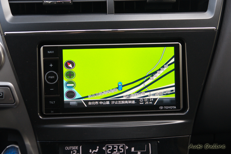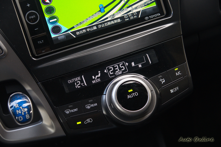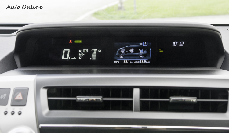簡潔明瞭的駕駛介面應該是進入Priusα車室之後所給人的印象,大部分的操作與功能顯示都是集中在中控台上,方向盤前方沒有儀錶組,而是在中控台上方的MID多功能行車資訊顯示幕來顯示車速、燃油剩餘量、(引擎、馬達)動力傳輸示意、里程數等行車資訊。如果不習慣視線要一直往旁邊移也沒關係,方向盤前的抬頭顯示器會把最常需要判讀的「車速」資訊投射在前擋風玻璃上。