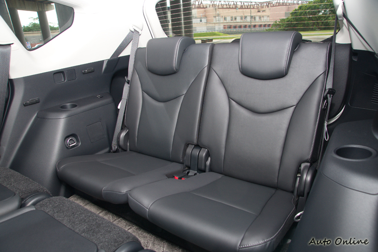 第三排座椅乘坐大人的話會略嫌侷促,不過坐小孩的話就還OK。頭部空間部分則是到三排都很充裕,且由於座椅是階梯式的設計,也就是說第三排的著坐位置高度較高,所以乘客的前方視野也都不錯。