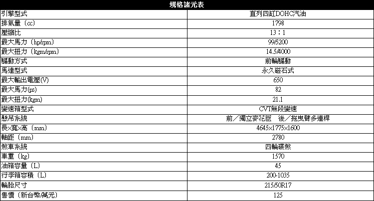 動力輸出數據上也是相同,1.8L引擎可輸出99hp/5200rpm最大馬力與14.5kgm/4000rpm最大扭力。馬達的最大馬力與最大扭力則分別為82hp與21.1kgm,整個系統的綜效最大馬力輸出則為136hp。不過為了讓車室有更寬敞的乘坐使用空間,驅動馬達所用的鋰電池組比較重量輕體積小,電池單元數為56Cells,配置於中央扶手的下方。