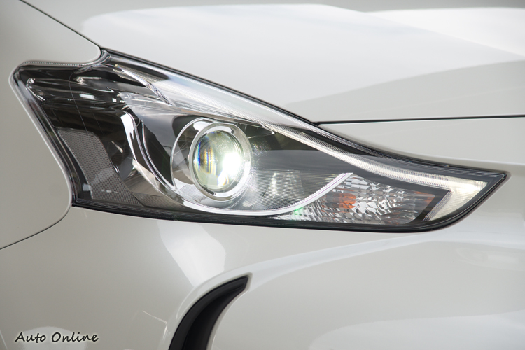 頭燈是遠光/近光雙功能合一的LED燈,燈組上方也導入了LED光條式燈眉,頭燈下方LED日間行車燈則整合至類似細長的進氣口設計中,這些設計與線條造型手法在TOYOTA甚至是其高級車品牌LEXUS車款身上都很常見到,也給人鮮明的TOYOTA世代家族印象。