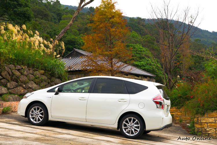 車側輪廓其實就像不少房車與旅行車的關係一樣,真正的差異都從B柱之後開始,為了提供第三排乘客足夠頭部的空間,所以車頂線條是維持水平,不像Prius車頂會向車尾傾斜下降。車側從前輪處向車尾上揚的肩線也頗像Prius。後車窗與尾門有做深色處理,胎圈則是215/50R17輪胎配上17吋多輻式樣鋁圈。