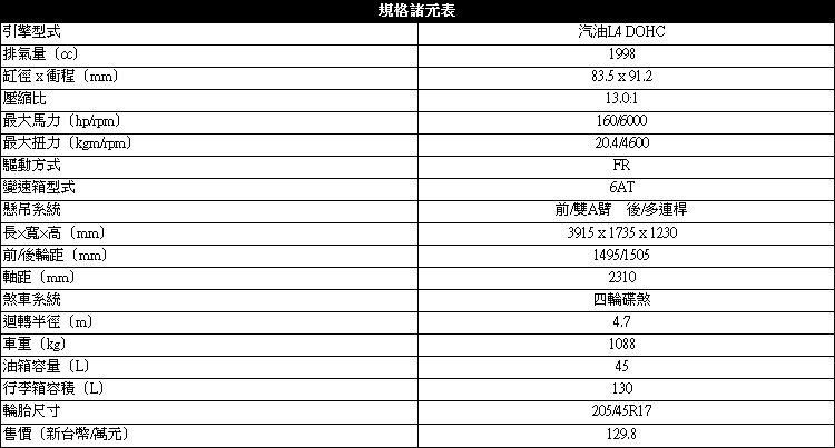 車上搭載的2000cc汽油引擎壓縮比高達13:1,最大馬力達到160ps,數據看起來不大,但別忘了它的車重只有1088公斤,還有50:50的完美配重比,所以加速時不但有馬力超過200ps的錯覺,高速衝入彎內也沒有太大壓力,更沒有跑車常有的生硬轉向感,真的是很好控制的車。