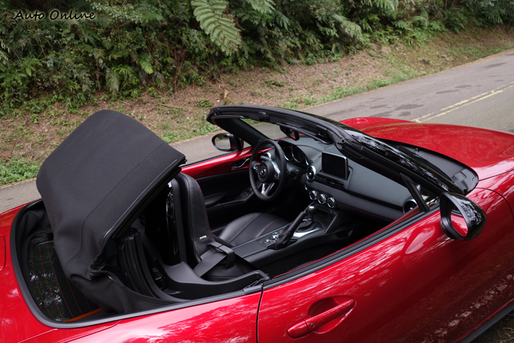 為了輕量化,MX-5沒有自動開閤的車頂機構,然而實際操作時就會發現這完全不會造成任何影響;除了關節設計讓它操作起來感覺輕巧,在開關車頂時即使是女性車主也能單手完成,緊急狀態下就算不停車也可以進行操作,堪稱傑作!這套車頂雖然只有簡單的鋁合金骨架和篷布構成,後窗玻璃還內埋除霧線,隔音效果當然比不上一般硬頂,但靜肅性之優異應該會讓很多人嚇一跳!而且開蓬狀態下風切聲不大,安裝擋風板後的效果明顯,顯然空氣力學考慮得很周全,唯一可惜的是,擋風板會稍微影響原本就已經相當狹窄的車內後視鏡視野。