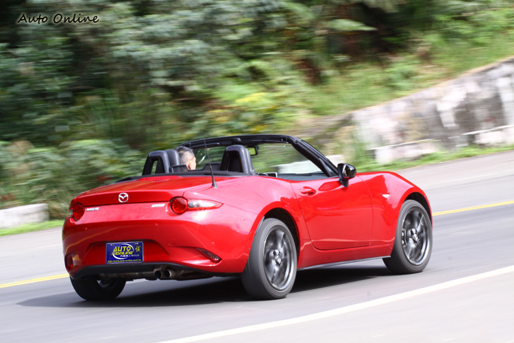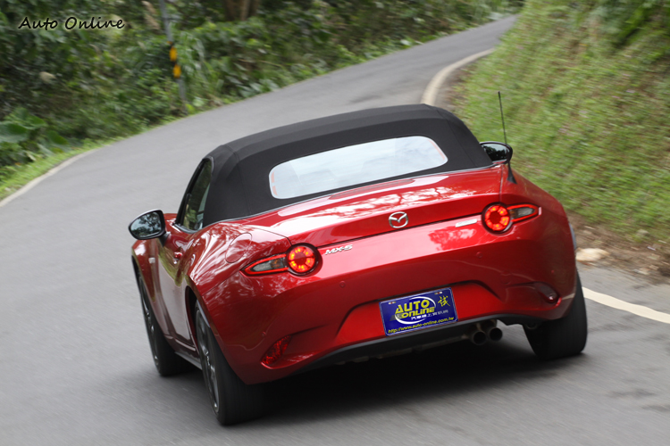 MX-5的座位低、車身重心也很低,加上避震彈簧偏硬,壓到貓眼石會有明顯的彈跳感,不過阻尼設定維持中性的緣故,讓它保有清晰的路感,卻不至於在不良路面上飽受顛簸之苦。它的轉向異常敏銳,加上後驅車的車身動態原本就很容易受到油門控制影響,奔馳在連續彎上特別爽快。