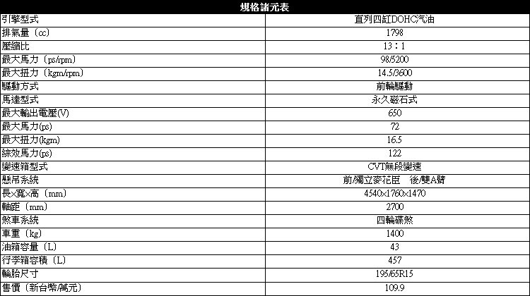 鋁圈搭載15吋195/65R15尺寸規格,原廠刻意在鋁圈外加上蓋子,目的是輪胎在轉動的時候降低擾流提升油耗表現。