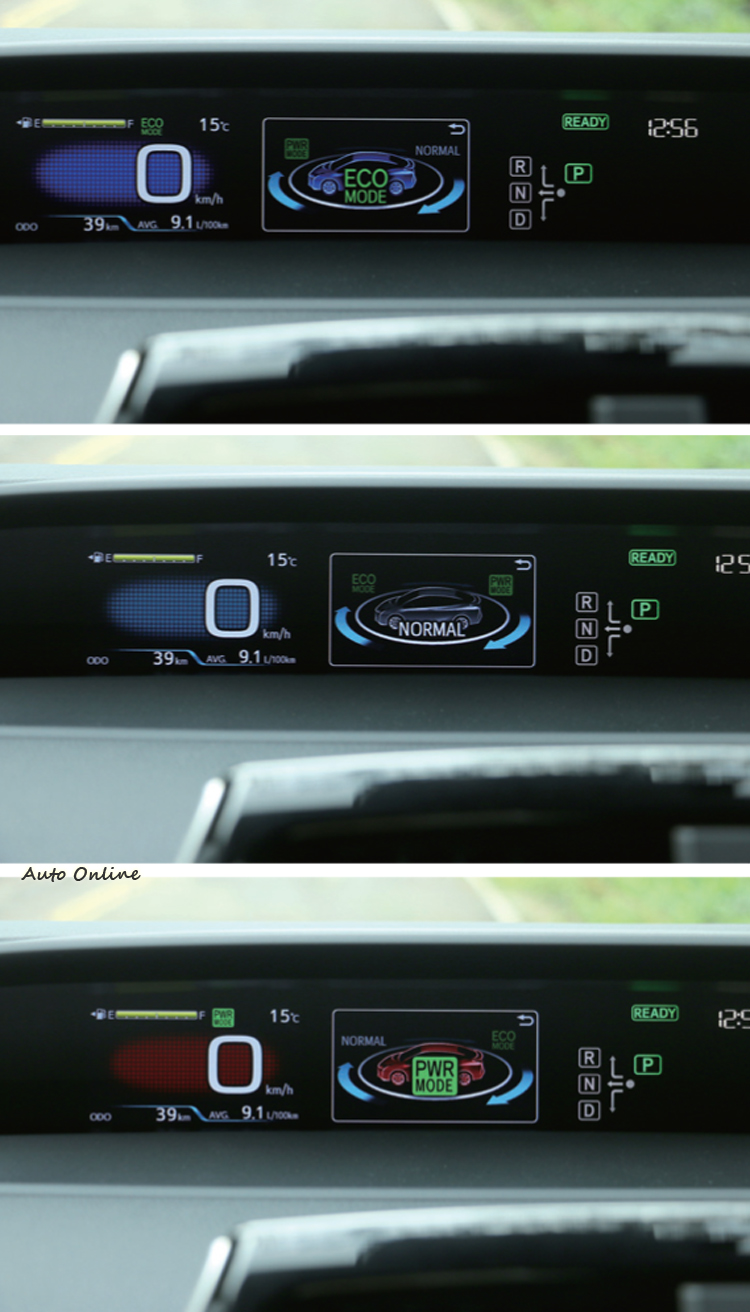 啟動Prius瞬間不會聽到引擎聲響,儀表板上只會顯示Ready燈號,這時輕撥排檔桿入D檔就能行駛。大多數起步只使用電動馬達,除非電力不夠或者駕駛大腳給油,引擎頓時瞬間介入,如果電池電量夠純電模式能行駛到58km/h最高時速,但是如果電腦偵測到電量不夠或者駕駛者過於激烈,引擎隨時會介入輔助,在試駕過程中,有一度純電模式只能行駛到38km/h,合理懷疑應該是電量不夠或者當時我正行駛在山區。混合動力Prius行車模式可分為三種一般、節能與運動,喔!不是!是四種,還有EV純電模式,不同模式最大差異是油門的敏銳度以及引擎、電動馬達運轉時機,駕駛者可以隨時切換想要的駕馭感受。