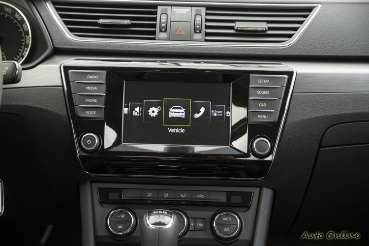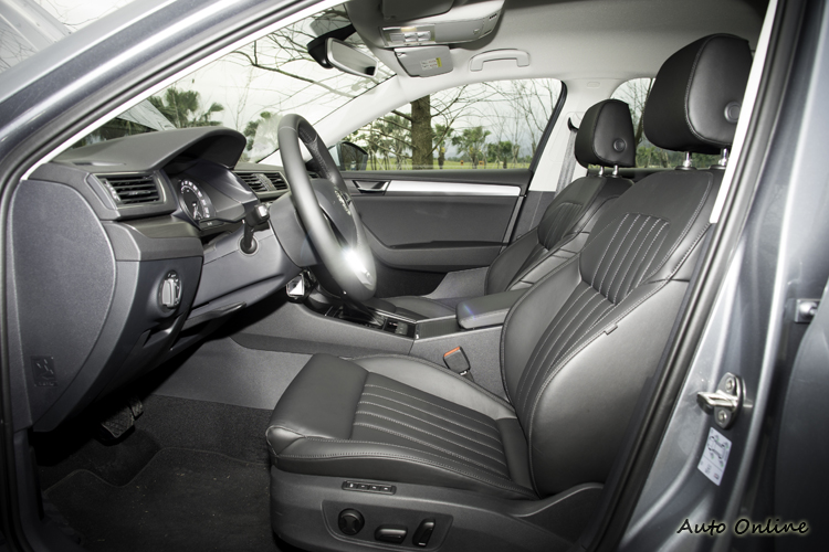 車室內以黑色為主調,搭配前方控台與車門內側的銀質處理金屬飾板,以及多處的細部鍍鉻飾框處理。加上造型上多為直線條的運用,更讓車室顯得比較方正、規矩、內斂、沈穩,設計師也用了斜線的概念將倒梯形的幾何元素加入其中,試圖在方正中避掉一些沈悶無趣的感覺。不過老實說,Superb真的比較不容易討到年輕族群的歡心,好在它鎖定的客層年齡本來也不低,喜歡清爽簡單的務實中年人士(不是大叔喔,哈)應該是可以接受。