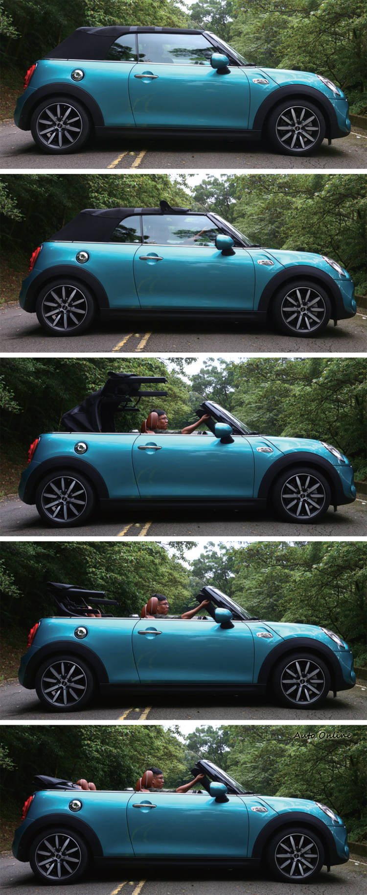 ![]() ▲MINI敞篷機構五連拍。![]() ▲車速30km/h內,短短的18秒就能完成開啟或收折頂蓬動作。![]() ▲敞篷開關就在前檔後方,第一段能只開40cm的開孔,第二段則全開蓬。![]() ▲如果怕吹亂頭髮,原廠提供手動迴風網裝置。![]() ▲菱格紋縫線的雙前座椅,包覆性與支撐性都有一定水準。