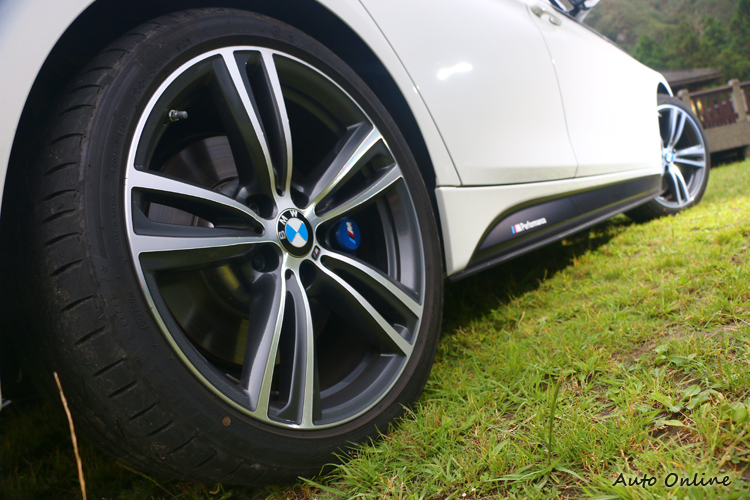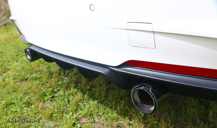 M Performance比起M Sport還帥氣![]() ▲外觀除了M款空力套件外,還搭配M Performance套件。回到外觀上,340i M Performance選用F30 M款空力套件,包含前、後保桿、側裙以及碳纖維小鴨尾,你會好奇這M款套件怎麼與330i M Sport外觀有些差異,因為除了M款空力套件外,還搭配M Performance套件,多了前保桿下方定風翼與後保桿Diffuser(擾流器),車頭鼻孔水箱護罩改為黑色,比起M Sport套件還多了老大哥M Power身影。 ![]() ▲排氣管為雙邊單出的M Performance排氣系統,發動引擎的瞬間很明顯聽到渾厚聲浪。![]() ▲碳纖維小鴨尾非常適合低調不張揚的車主個性。![]() ▲鋁圈採前8J、後8.5J的M款雙輻式422M型。
