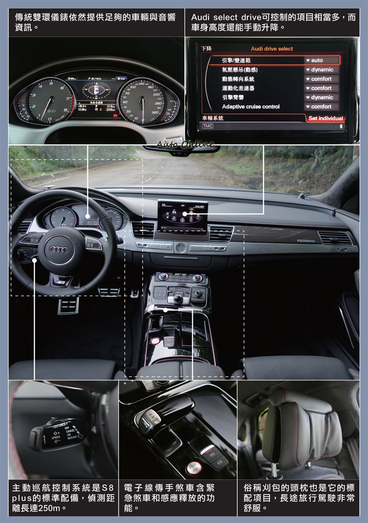 ![]() ▲輕快的反應以及毫不遲疑的動力,真的捨得讓司機獨享嗎?S8 plus開起來有出乎意料之外的輕盈感,這從外表看來實在很難想像,不過幾乎我們接觸過的500hp以上等級性能車,都有相同特性。從comfort換成dynamic模式,會感覺車子像是被注入一管強心針,整輛車都活了起來!而這組可程式車身動態系統也不只是影響引擎和變速箱,它也連帶影響氣壓懸吊阻尼、轉向反應和排氣聲浪,甚至包括主動巡航控制(ACC)。特別一提的是,這具V8引擎並不會如預期發出轟隆作響的聲浪,但低吼有力的聲音仍足以引起山路上其他車友的注意,正如同它的外型一樣,以最恰如其分的方式展現它的威武與尊貴。