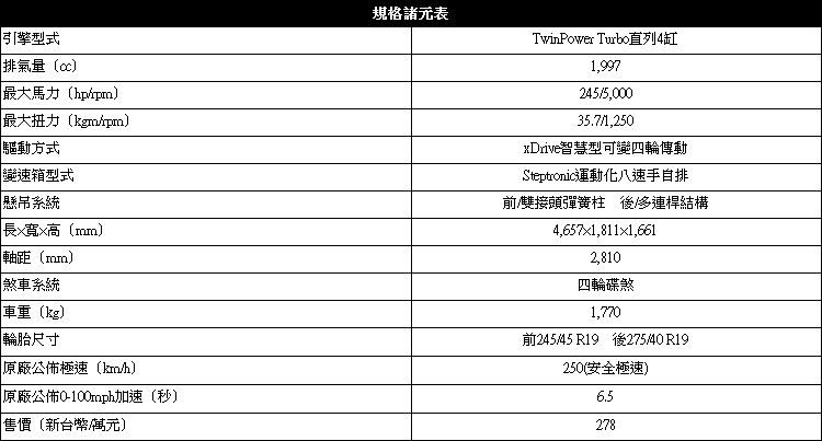 ▲X3 xDrive28i搭載一顆2.0升渦輪增壓引擎,靜止加速到百公里只需要6.5秒。