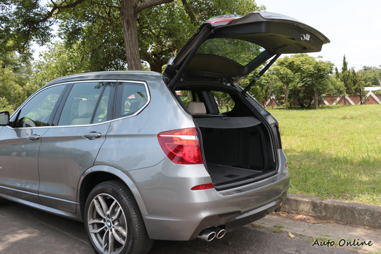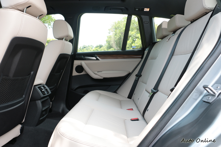 中型豪華休旅車X3,軸距來到2,810mm與同級對手相比,營造出寬廣車室空間,其後座腿部、手肘與頭部空間亮眼;後座獨立的冷氣出門孔,有極佳的冷房效果。後行李廂置物空間表現不差,容積有550L,透過後座椅背40:20:40的傾倒功能,瞬間增加為1,600L。