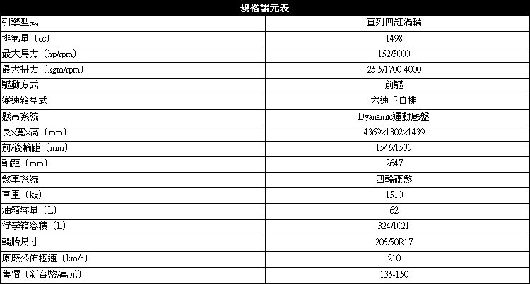 雖說是入門動力,實際開起來儘管在起步、低速時要油門反應比較遲緩些,當車速進入中低的常用速域轉速約二千轉以上時,在渦輪啟動之下充沛的扭力立即帶來順暢有力的加速感覺。D檔位下在顧及油耗經濟之下加速力的拉升或許略緩些,但變速箱倒是相當聰明,只要有比較快的踩踏油門動作,油門深度只要約1/3就能立刻有如kick down般快速拉出轉速,迅速而明快地急加速,對於切換車道超車或爬坡加速等需求都能輕鬆且易預測地完成。S模式下換檔時機與油門反應也有很明顯地「積極化」,略含油門即可維持2~3000轉,等待駕駛隨時油門加深讓車子疾衝而出。