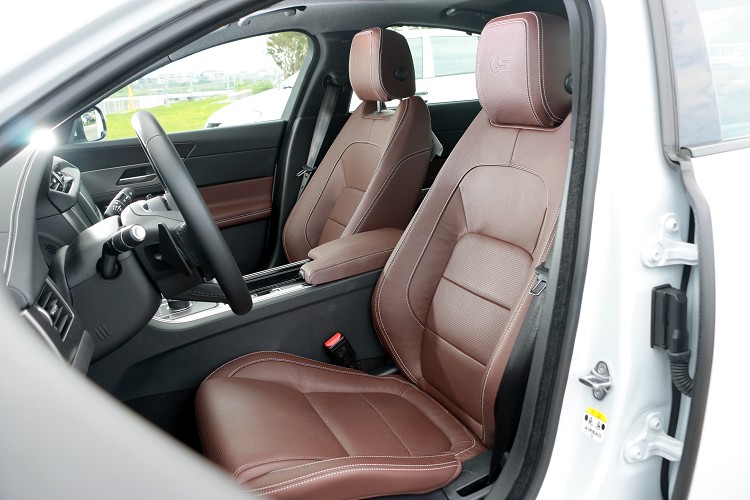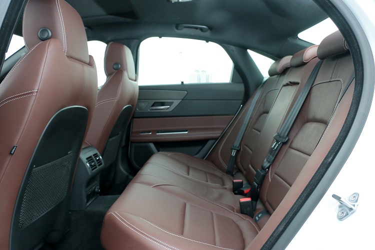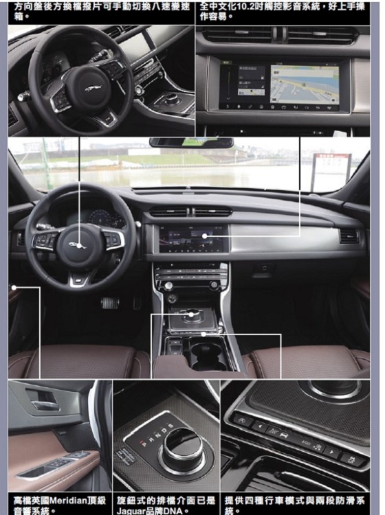 中控台上方10.2吋inControl Pro智慧多媒體全觸控螢幕,沒有實體按鍵,操作全由螢幕觸控,功能與先前試駕過的XF相同,全中文化顯示好上手不易出錯。Pro版的inControl系統,有個賽道模式功能,提供賽道設定、G力表、碼表計時與踏板深淺監控,車輛一舉一動都在記錄之中。除了美學、科技外,四門轎車空間不能馬虎,車身尺寸長、寬、高分別為4,954mm、1,880mm、1,457mm,車身總長比起前一代縮短7mm,但軸距增加51mm,達到2,960mm的水準,後座膝部增加24mm,後座頭部空間也增加27mm,後座乘載龐德女郎有舒適又快活的乘坐空間。