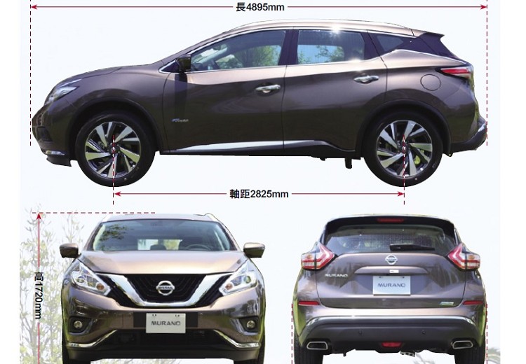 2014年的紐約車展中發表第三代Murano,2015年正式量產。來到第三代車型不僅留有美國魂之外,還加入歐洲美學細緻度大大進化。先從外觀來看,新世代車型有著深邃的未來感,利用誇張的折線突顯出律動感,外觀完美移植RESONANCE概念車設計風格,車頭採用V-Motion設計元素,有點類似X-Trail的水箱護罩只是面積更大。前後燈具承襲Nissan 370Z的迴力鏢造型,頭燈內有LED遠、近光燈,後尾燈除了方向燈與倒車燈其餘則是LED光源,在夜晚塑造出最搶眼的識別特徵。
